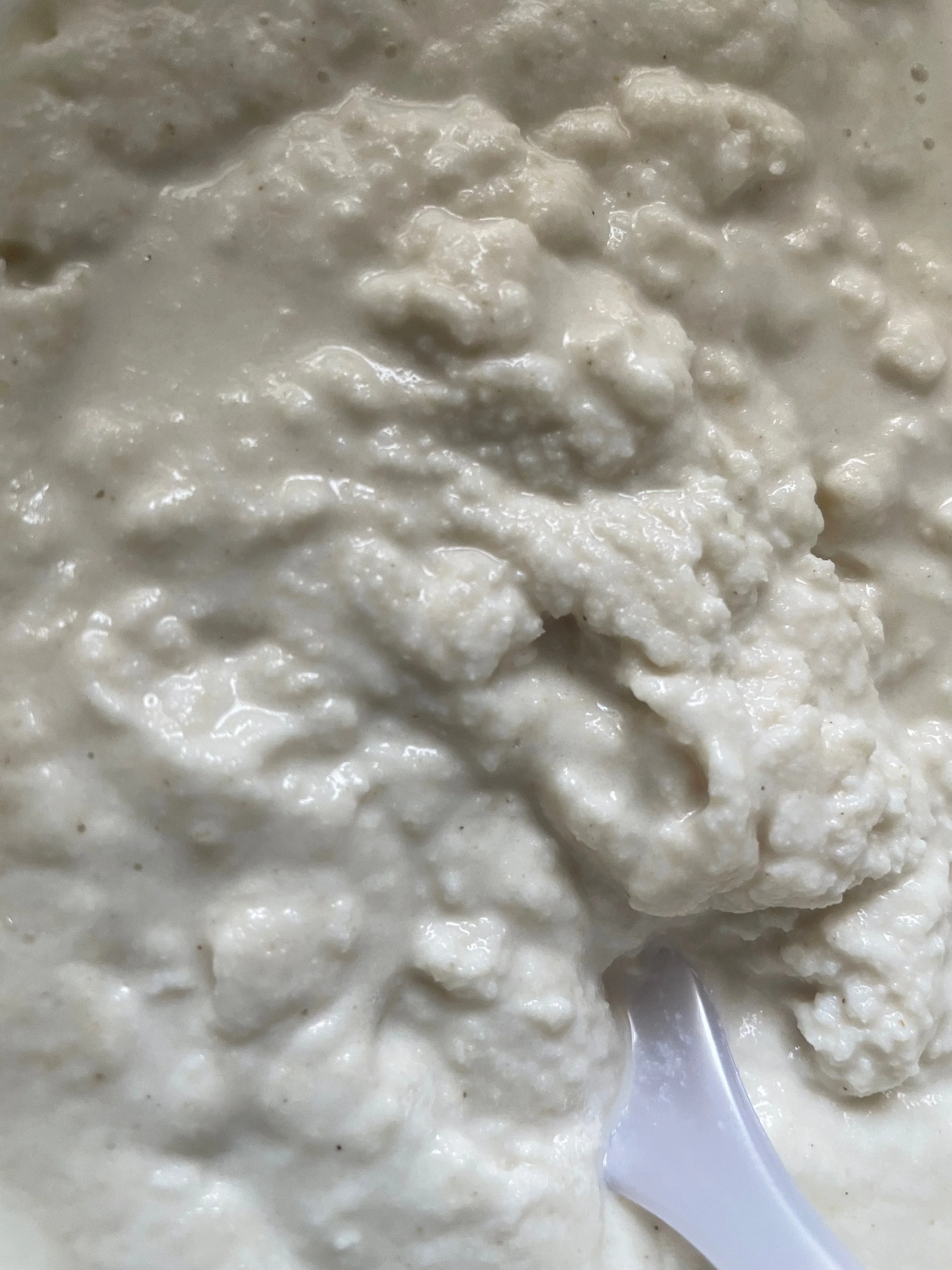 Gestern Abend wurder meine Sauerteigansatz aus dem Kühlschrank wieder aktiviert. Mit 200 g Vollreismehl und 200 g Wasser habe ich ihn zu einem glatten Brei verrührt. Über Nacht stand er abgedeckt bei Zimmertemperatur und sah heute morgen so auc.